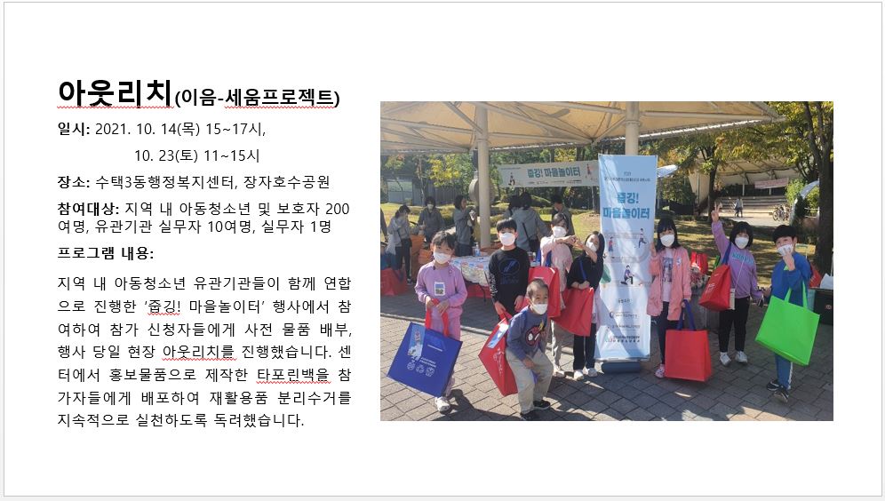 2021년 10월 아웃리치-이음 세움 프로젝트(학교밖) 작성자 관리자 등록일자 2022년 1월 10일 11시 55분 18초 조회 452 학교밖-아웃리치(이음-세움 프로젝트, 10월).JPG [ Size : 108.17KB , Down : 221 ] 미리보기 다운로드 목록보기
