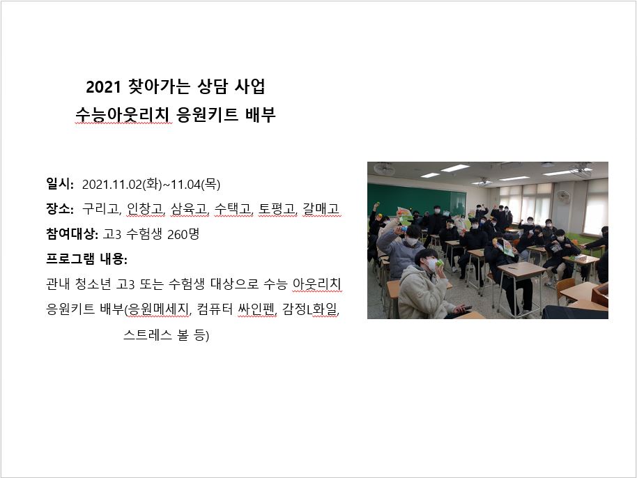 2021년 11월 찾아가는 상담(수능 아웃리치) 작성자 관리자 등록일자 2022년 1월 17일 15시 25분 47초 조회 447 11월 찾아가는 상담(수능 아웃리치).JPG [ Size : 68.45KB , Down : 228 ] 미리보기 다운로드 목록보기