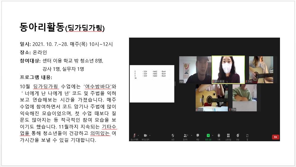 2021년 10월 동아리활동-딩가딩가링(학교밖) 작성자 관리자 등록일자 2022년 1월 10일 11시 53분 54초 조회 437 학교밖-동아리활동(딩가딩가링, 10월).JPG [ Size : 80.46KB , Down : 227 ] 미리보기 다운로드 목록보기