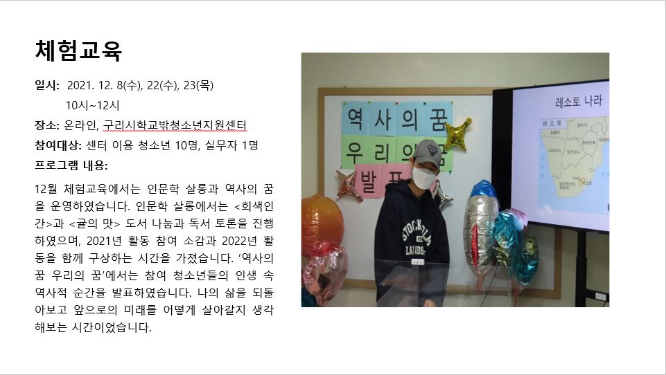 2021년 12월 체험교육(학교밖) 작성자 관리자 등록일자 2022년 1월 24일 11시 46분 0초 조회 659 체험교육(학교밖).JPG [ Size : 83.95KB , Down : 289 ] 미리보기 다운로드 목록보기
