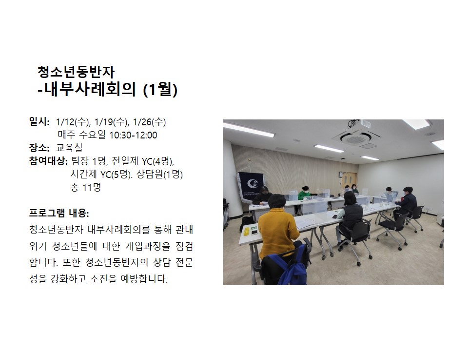 2022년 1월 청소년동반자 내부사례회의 작성자 관리자 등록일자 2022년 2월 11일 17시 41분 13초 조회 654 청소년동반자 내부사례회의(1월).JPG [ Size : 99.97KB , Down : 282 ] 미리보기 다운로드 목록보기
