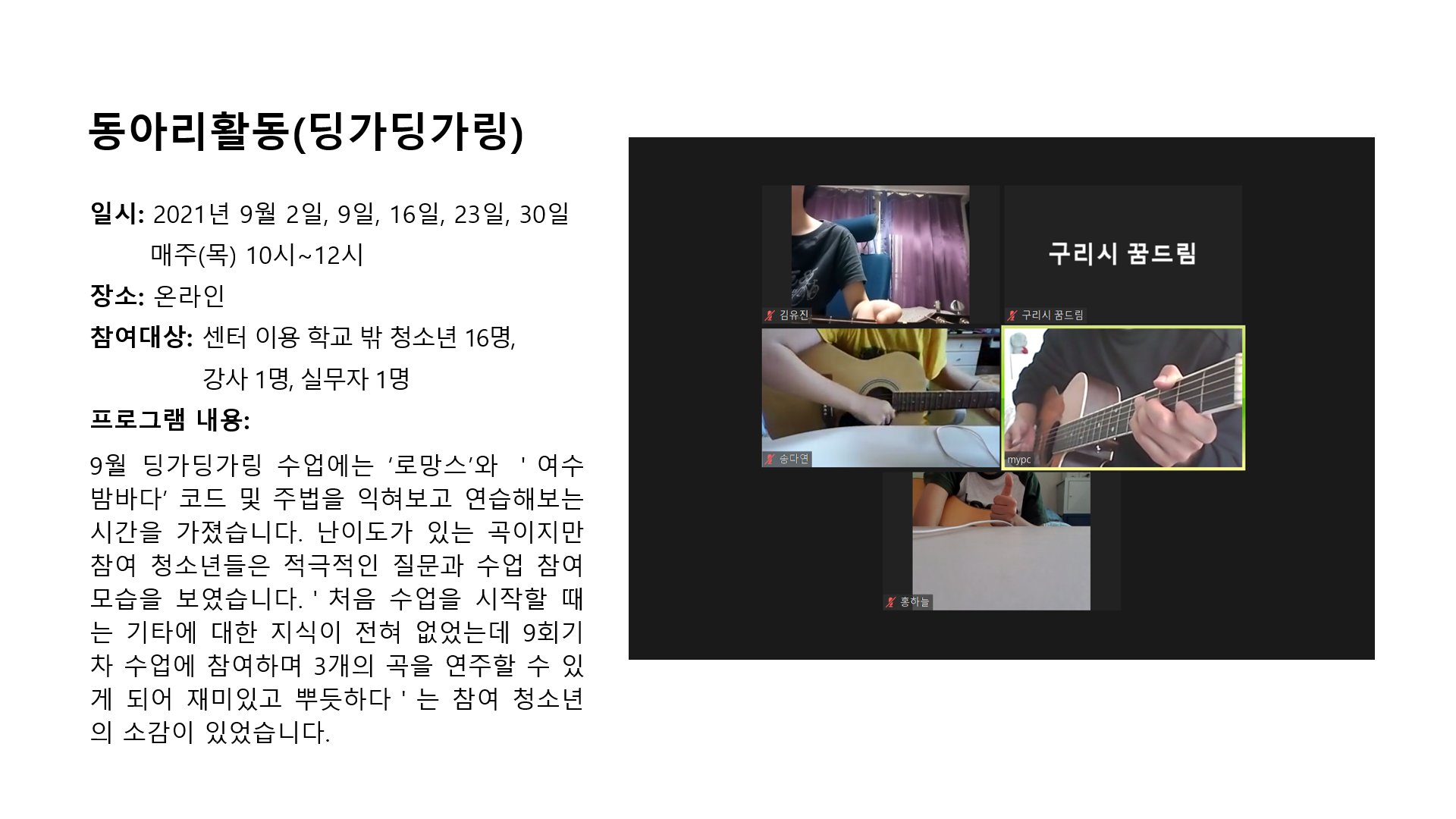 동아리활동 딩가딩가링(학교밖) 작성자 관리자 등록일자 2021년 10월 1일 19시 15분 34초 조회 459 학교밖-동아리활동(딩가딩가링,9월).png [ Size : 441.8KB , Down : 228 ] 미리보기 다운로드 목록보기
