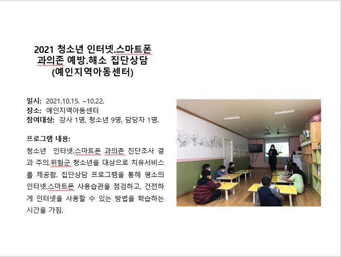 2021년 10월 인터넷.스마트폰 과의존 예방.해소 집단상담(예인지역아동센터) 작성자 관리자 등록일자 2022년 1월 10일 13시 26분 6초 조회 575 인터넷(예인지역아동센터).JPG [ Size : 56.88KB , Down : 323 ] 미리보기 다운로드 목록보기