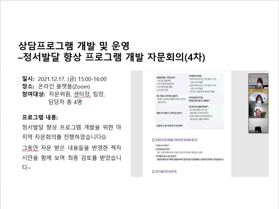 2021년 12월 상담프로그램 개발 및 운영-자문회의 작성자 관리자 등록일자 2022년 1월 17일 16시 25분 8초 조회 586 12월 상담프로그램 개발 및 운영-자문회의.JPG [ Size : 77.07KB , Down : 321 ] 미리보기 다운로드 목록보기