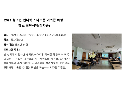 2021 청소년 인터넷.스마트폰 과의존 예방.해소 집단상담(장자중) 작성자 관리자 등록일자 2021년 9월 6일 12시 44분 56초 조회 510 인터넷-장자중.png [ Size : 71.41KB , Down : 233 ] 미리보기 다운로드 목록보기