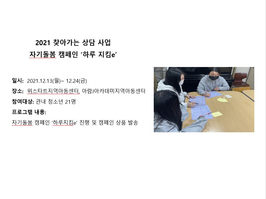 2021년 12월 찾아가는 상담(하루지킴e) 작성자 관리자 등록일자 2022년 1월 17일 16시 18분 17초 조회 534 12월 찾아가는 상담(하루지킴e).JPG [ Size : 55.52KB , Down : 252 ] 미리보기 다운로드 목록보기
