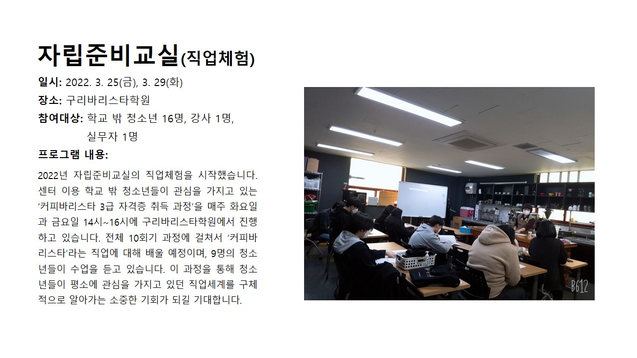 2022년 3월 자립준비교실_직업체험 (학교밖) 작성자 관리자 등록일자 2022년 4월 5일 9시 19분 27초 조회 510 자립준비교실(직업체험).JPG [ Size : 165.59KB , Down : 208 ] 미리보기 다운로드 목록보기