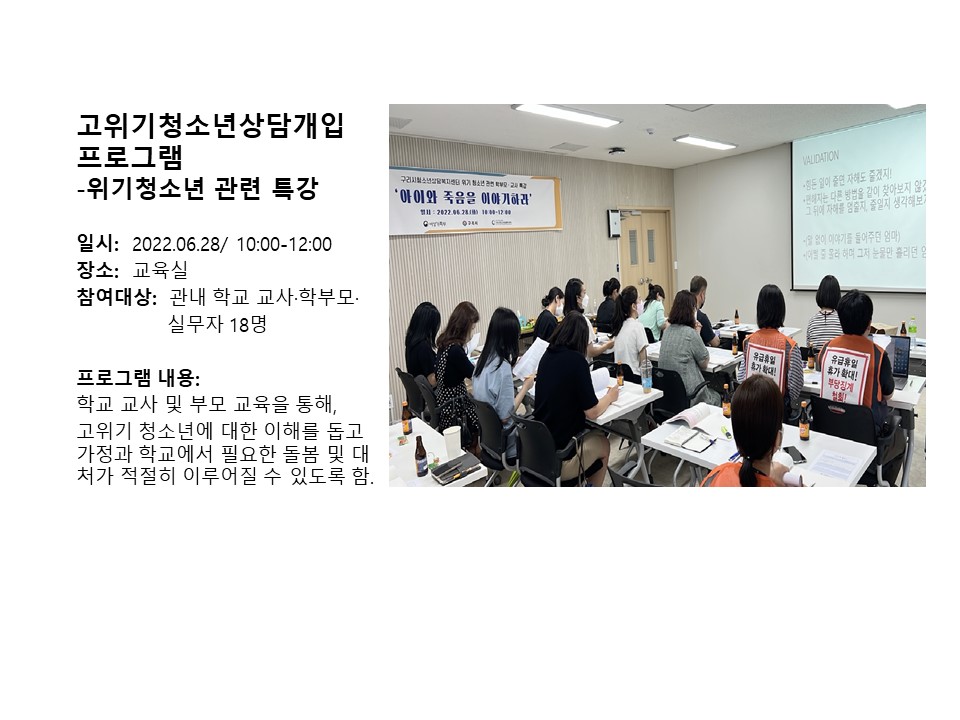2022년 6월 고위기청소년상담개입 프로그램-위기청소년 관련 특강 작성자 관리자 등록일자 2022년 7월 8일 14시 26분 30초 조회 600 2022년 6월 고위기청소년상담개입 프로그램-위기청소년 관련 특강.JPG [ Size : 115.25KB , Down : 379 ] 미리보기 다운로드 목록보기