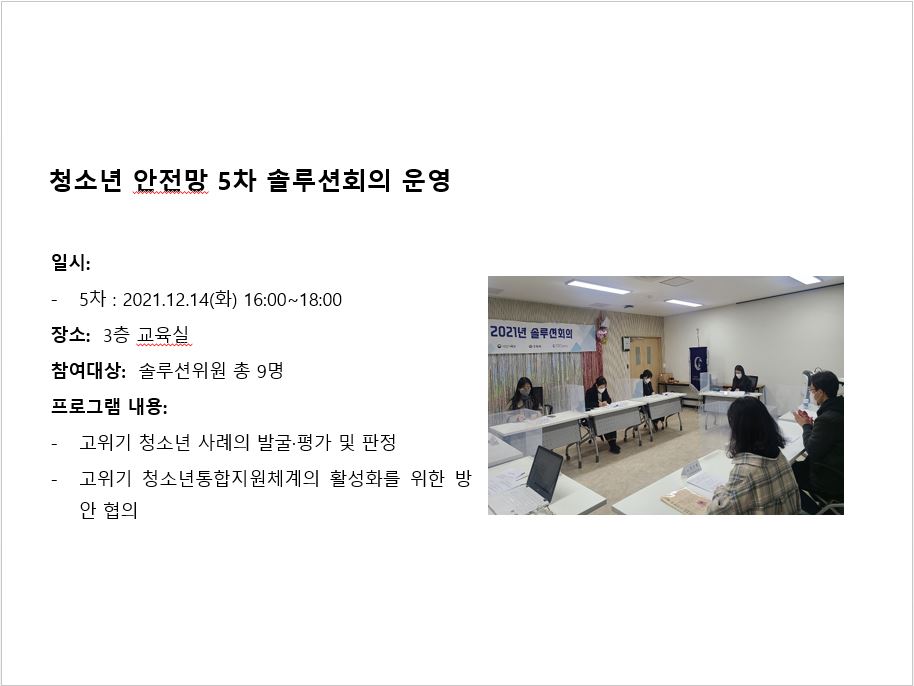 2021년 12월 청소년 안전망 5차 솔루션회의 작성자 관리자 등록일자 2022년 1월 17일 16시 18분 59초 조회 541 12월 청소년안전망 제5차 솔루션회의.JPG [ Size : 60.88KB , Down : 254 ] 미리보기 다운로드 목록보기