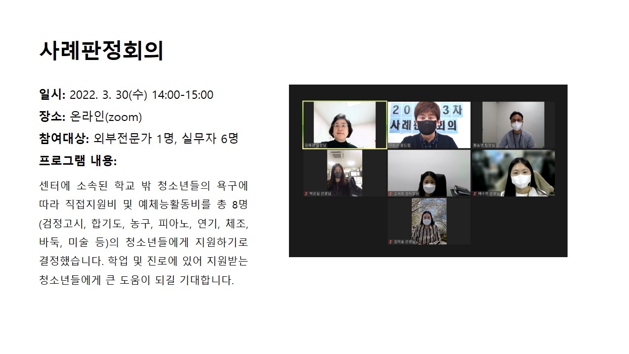 2022년 3월 사례판정회의 (학교밖) 작성자 관리자 등록일자 2022년 4월 5일 9시 23분 5초 조회 517 사례판정회의.JPG [ Size : 114.72KB , Down : 274 ] 미리보기 다운로드 목록보기