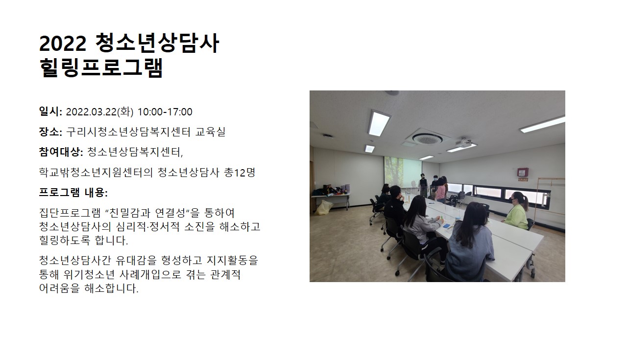 2022년 3월 청소년상담사 힐링프로그램 작성자 관리자 등록일자 2022년 4월 5일 9시 25분 18초 조회 606 힐링프로그램.JPG [ Size : 131.67KB , Down : 261 ] 미리보기 다운로드 목록보기