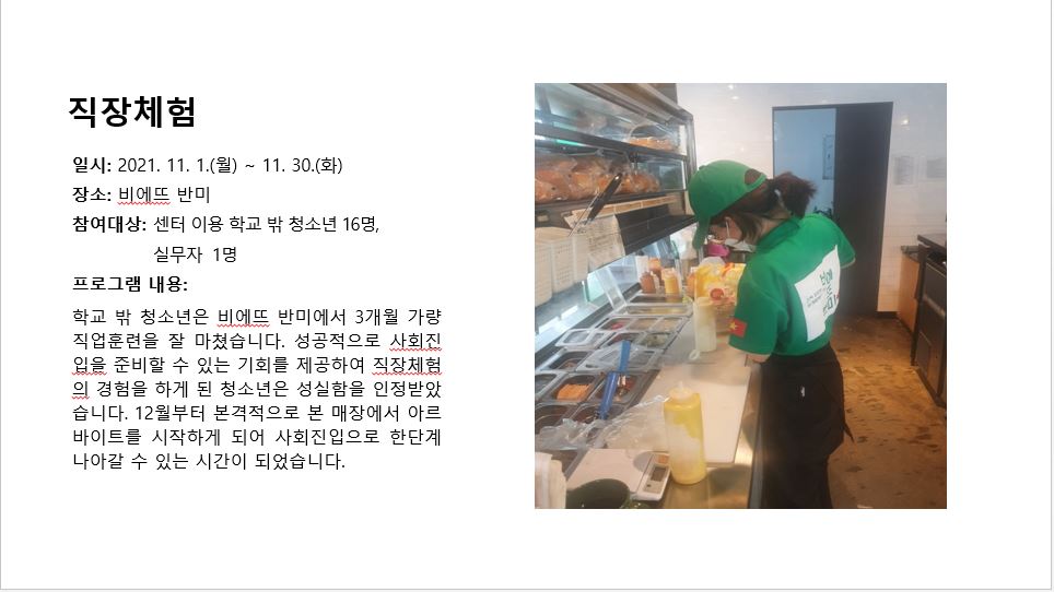 2021년 11월 직장체험(학교밖) 작성자 관리자 등록일자 2022년 1월 17일 16시 11분 47초 조회 508 11월 직장체험.JPG [ Size : 75.36KB , Down : 237 ] 미리보기 다운로드 목록보기