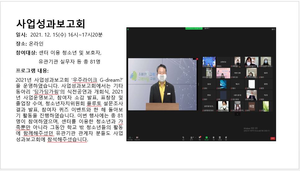 2021년 12월 사업성과보고회(학교밖) 작성자 관리자 등록일자 2022년 1월 24일 11시 48분 49초 조회 582 사업성과보고회(학교밖).JPG [ Size : 86.95KB , Down : 255 ] 미리보기 다운로드 목록보기
