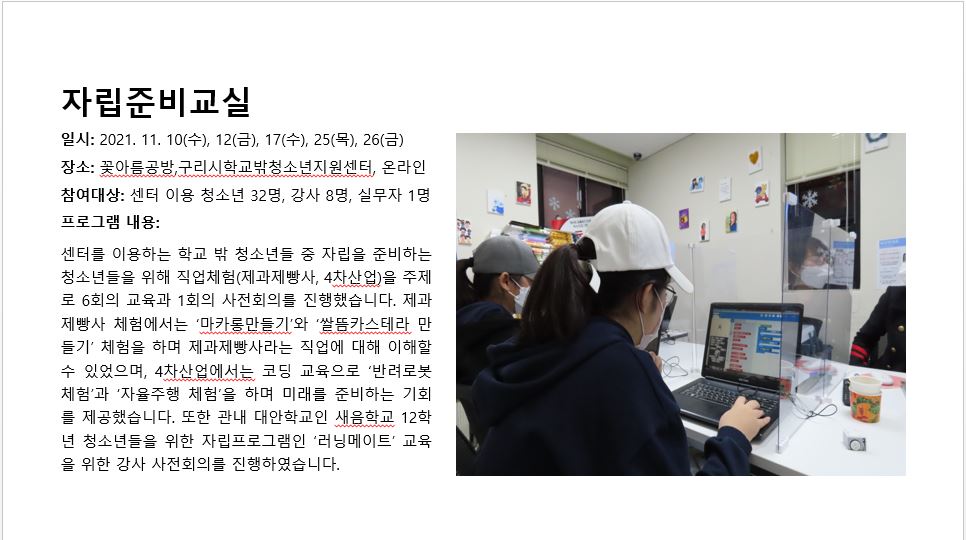 2021년 11월 자립준비교실(학교밖) 작성자 관리자 등록일자 2022년 1월 17일 16시 12분 10초 조회 509 11월 자립준비교실.JPG [ Size : 92.75KB , Down : 217 ] 미리보기 다운로드 목록보기