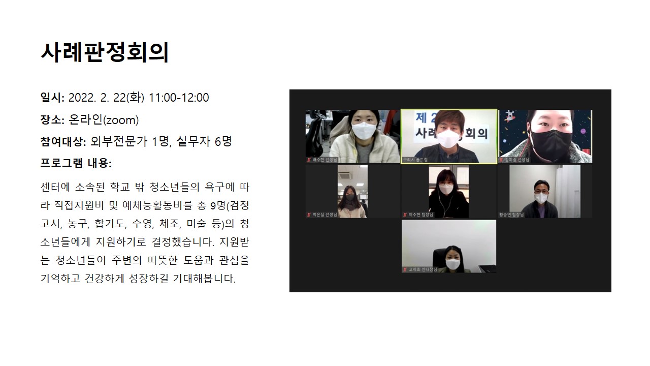 2022년 2월 사례판정회의(학교밖) 작성자 관리자 등록일자 2022년 3월 7일 10시 24분 5초 조회 584 사례판정회의.JPG [ Size : 117.66KB , Down : 272 ] 미리보기 다운로드 목록보기