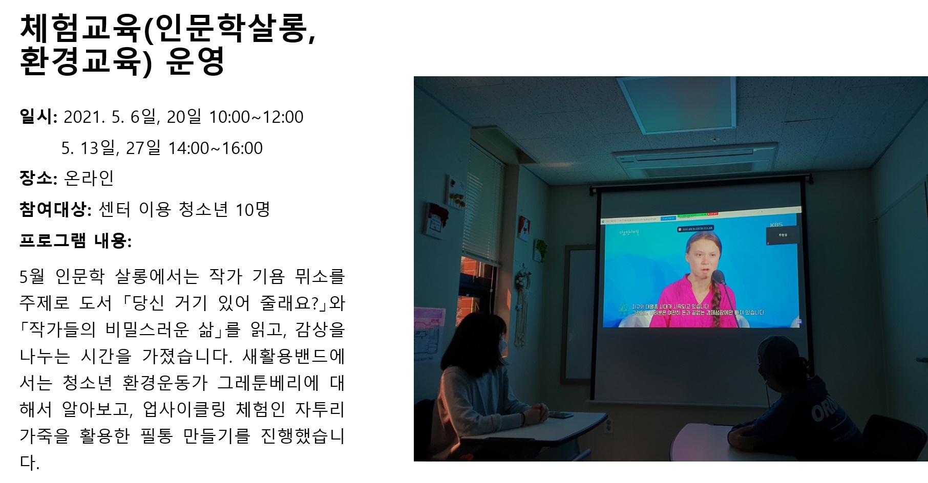 5월 체험교육 작성자 관리자 등록일자 2021년 5월 25일 17시 6분 40초 조회 513 - 5월 체험교육(인문학살롱, 환경교육) 운영.jpg [ Size : 290.41KB , Down : 238 ] 미리보기 다운로드 목록보기