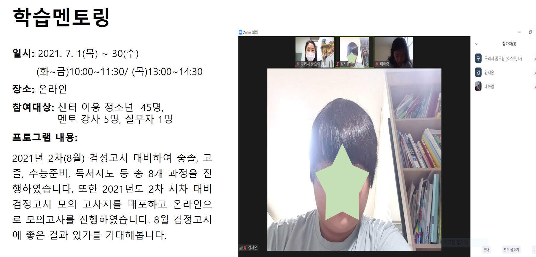 7월 학습멘토링 작성자 관리자 등록일자 2021년 8월 4일 17시 21분 10초 조회 604 7월 학습멘토링.jpg [ Size : 219.86KB , Down : 304 ] 미리보기 다운로드 목록보기