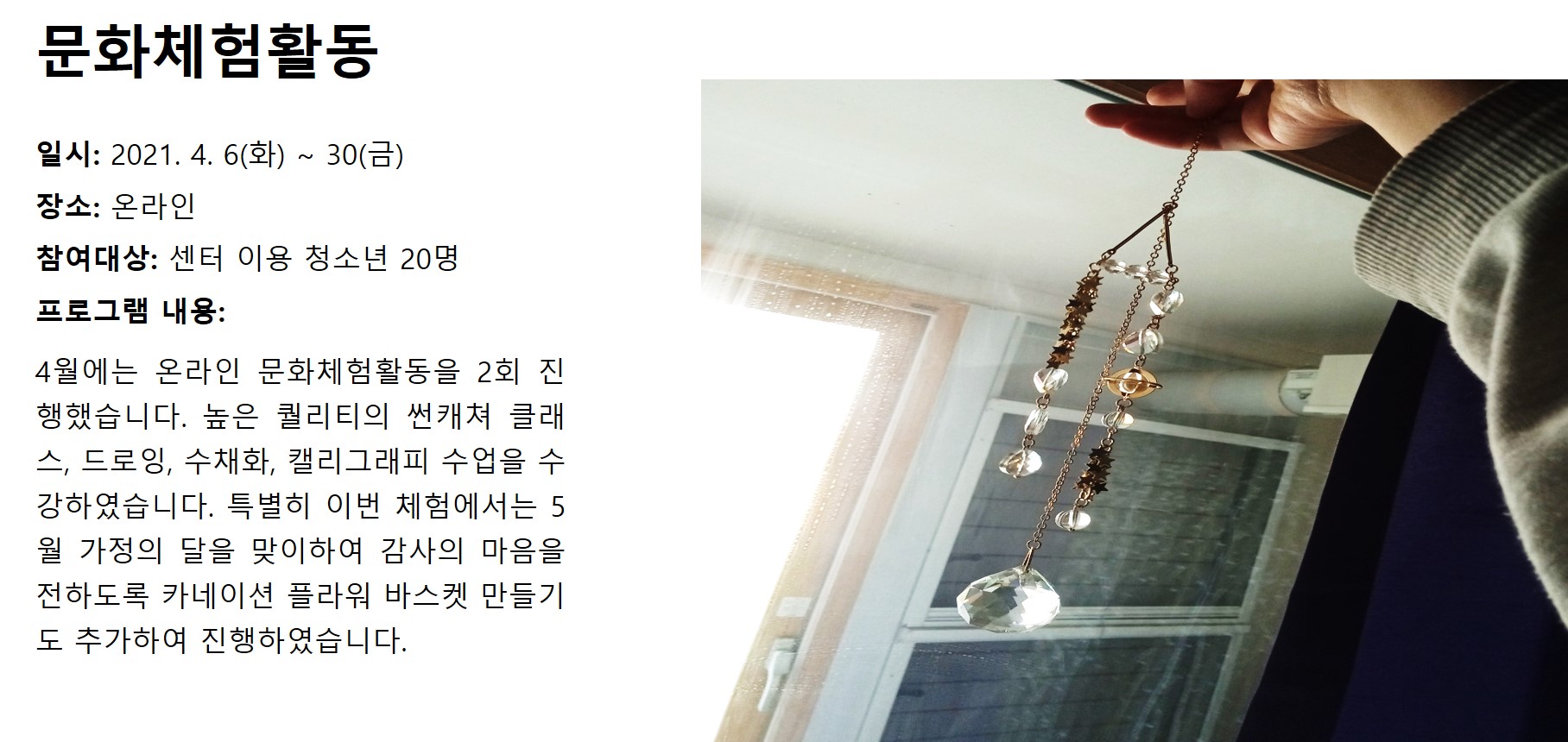 4월 문화체험활동 작성자 관리자 등록일자 2021년 5월 17일 12시 46분 29초 조회 472 - 4월 문화체험활동 .jpg [ Size : 252.62KB , Down : 222 ] 미리보기 다운로드 목록보기