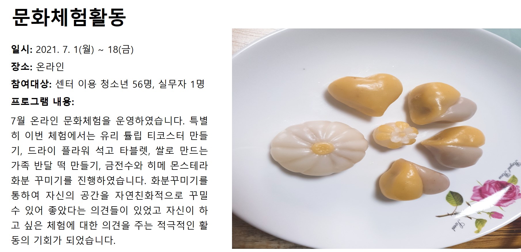 7월 문화체험활동 작성자 관리자 등록일자 2021년 8월 4일 15시 9분 48초 조회 495 7월 문화체험활동.jpg [ Size : 239.77KB , Down : 240 ] 미리보기 다운로드 목록보기