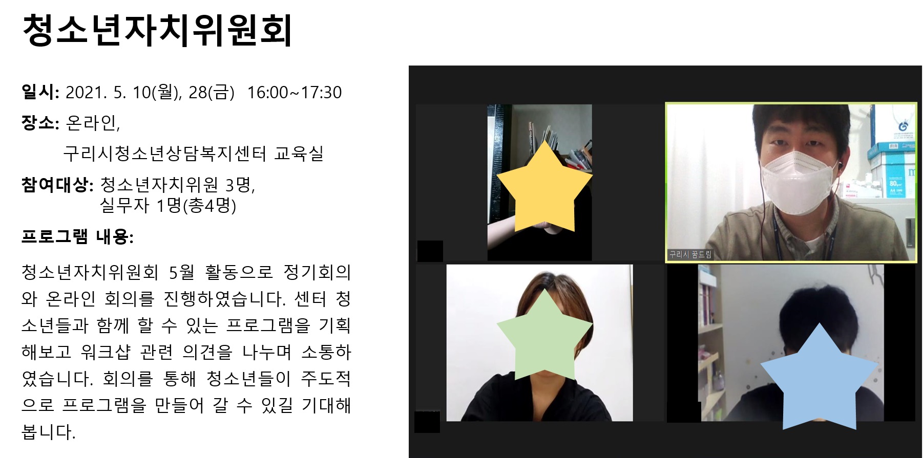 5월 청소년자치위원회 작성자 관리자 등록일자 2021년 5월 25일 17시 6분 25초 조회 482 - 5월 청소년자치위원회.jpg [ Size : 255.28KB , Down : 233 ] 미리보기 다운로드 목록보기