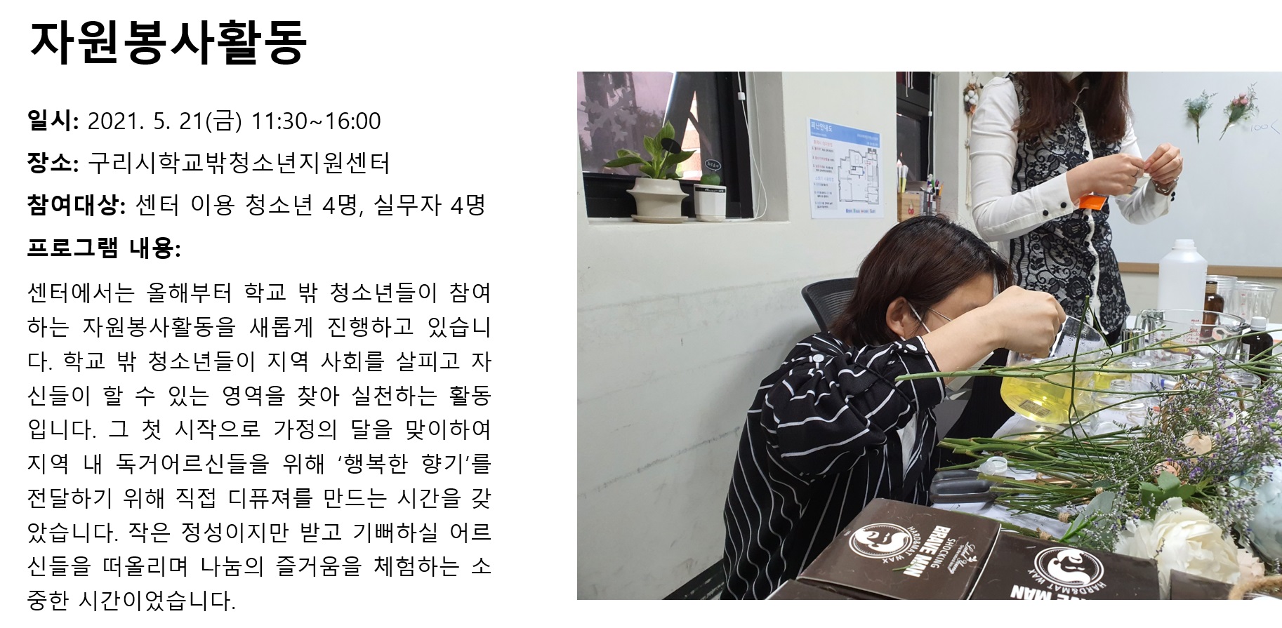 5월 자원봉사활동 작성자 관리자 등록일자 2021년 5월 25일 17시 5분 18초 조회 455 body{font-family: Tahoma,Verdana,Arial;font-size: 11px;color: #555555;margin: 0px}td{font-size :11px; font-family: Tahoma,Verdana,Arial;}p{margin-top:1px;margin-bottom:1px;} 5월 자원봉사활동.jpg [ Size : 439.71KB , Down : 214 ] 미리보기 다운로드 목록보기