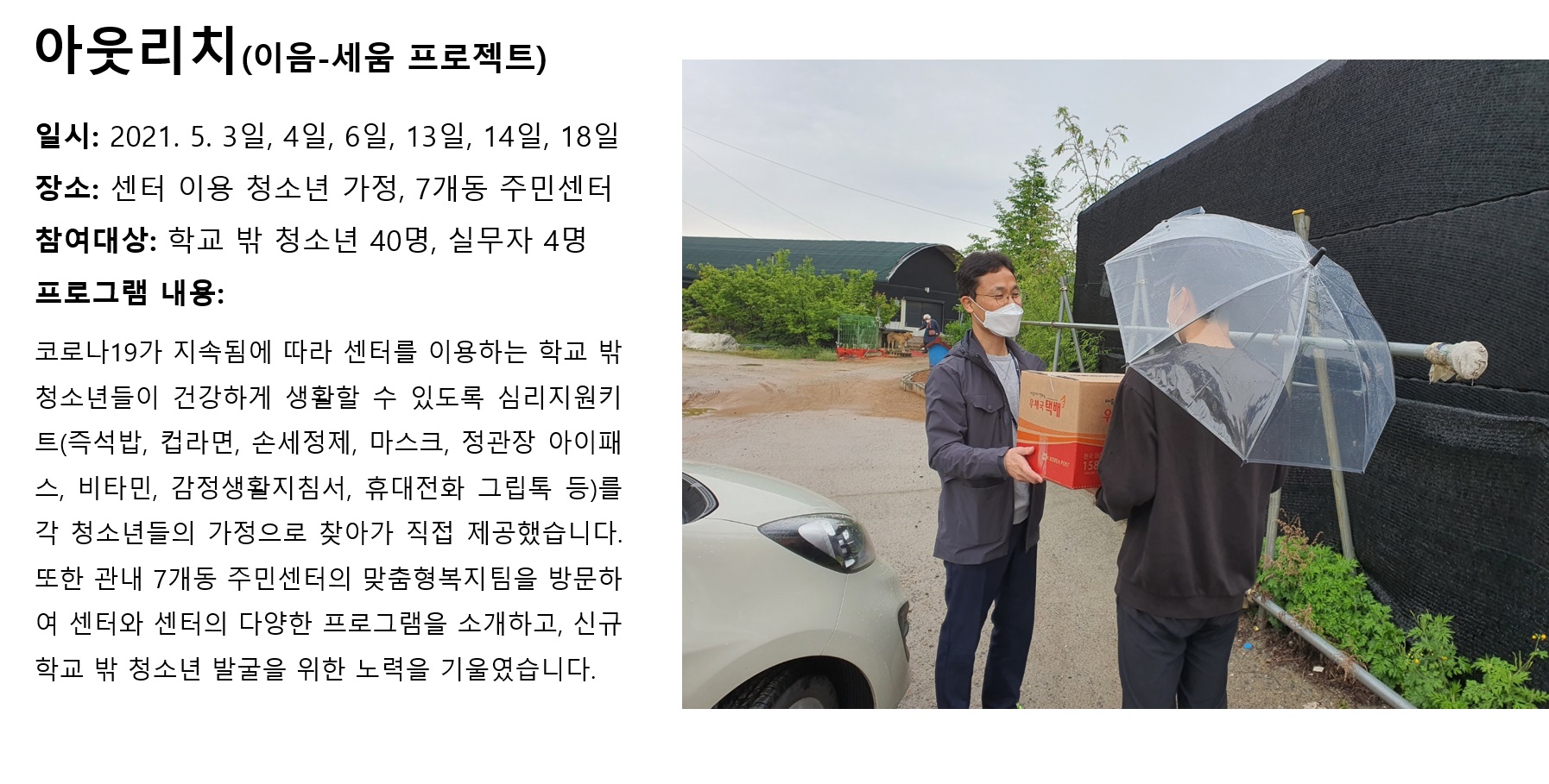 5월 아웃리치 작성자 관리자 등록일자 2021년 5월 25일 17시 2분 48초 조회 482 body{font-family: Tahoma,Verdana,Arial;font-size: 11px;color: #555555;margin: 0px}td{font-size :11px; font-family: Tahoma,Verdana,Arial;}p{margin-top:1px;margin-bottom:1px;} 5월 아웃리치.jpg [ Size : 438.31KB , Down : 238 ] 미리보기 다운로드 목록보기