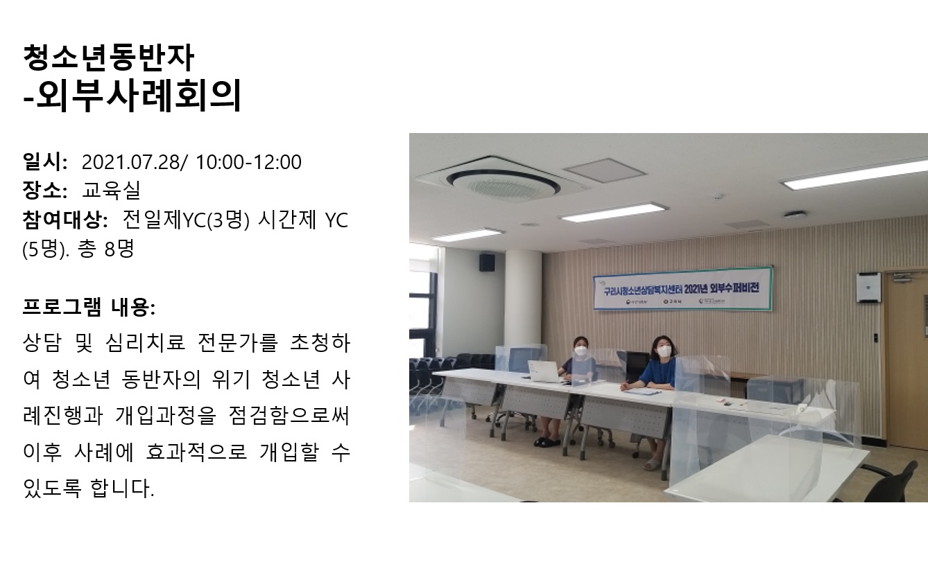 7월 청소년동반자-2차 외부사례회의 작성자 관리자 등록일자 2021년 8월 4일 13시 37분 27초 조회 698 7월 청소년동반자-외부사례회의2.jpg [ Size : 180.17KB , Down : 333 ] 미리보기 다운로드 목록보기