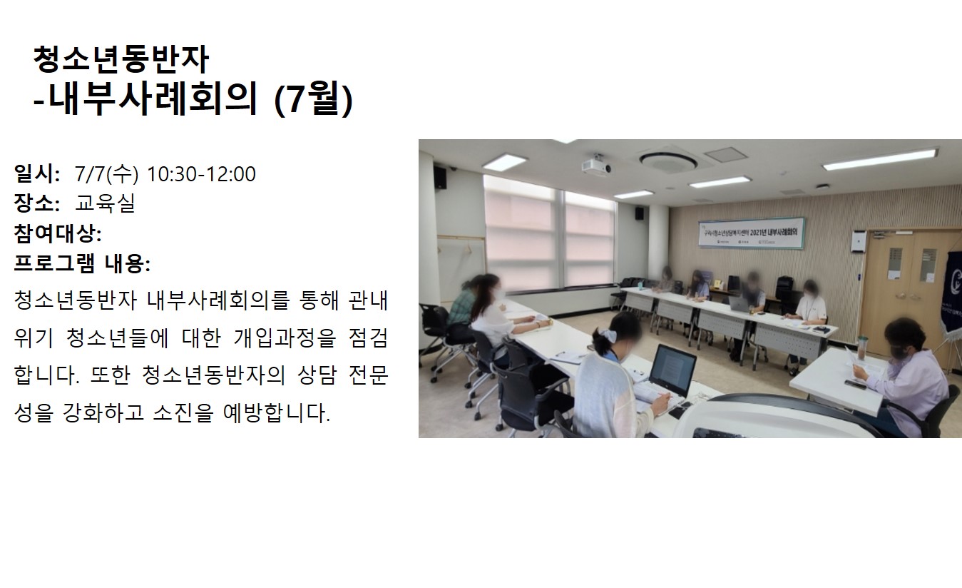 7월 청소년동반자-내부사례회의 작성자 관리자 등록일자 2021년 8월 4일 13시 30분 20초 조회 671 7월 청소년동반자-내부사례회의.jpg [ Size : 149.02KB , Down : 310 ] 미리보기 다운로드 목록보기