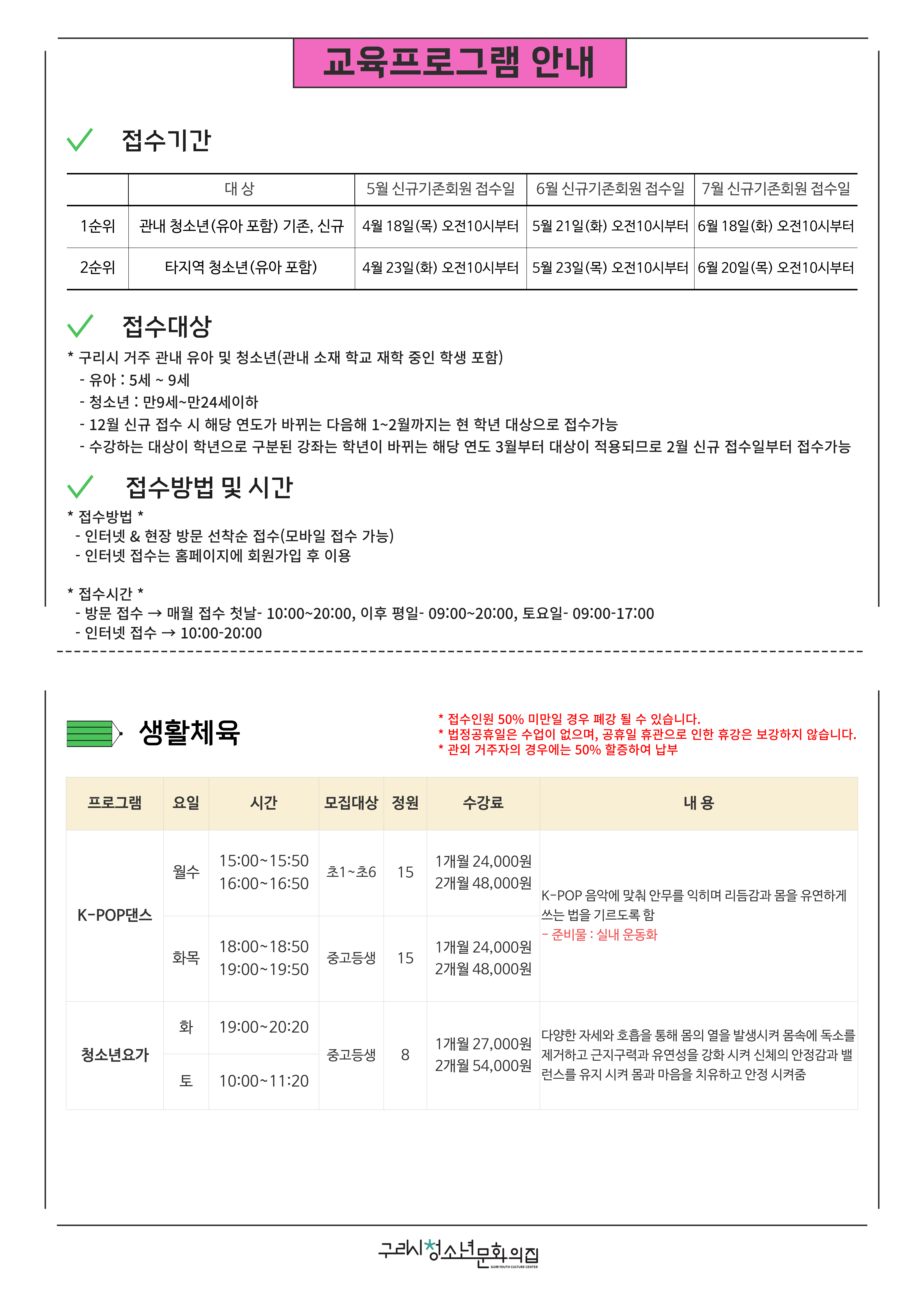 구리시청소년문화의집 5월 진행예정 교육프로그램 안내 작성자 김윤지 등록일자 2024년 3월 7일 11시 13분 38초 조회 875 프로그램(5월) 1.jpg [ Size : 2.88MB , Down : 485 ] 미리보기 다운로드 프로그램(5월) 2.jpg [ Size : 4.75MB , Down : 482 ] 미리보기 다운로드 목록보기
