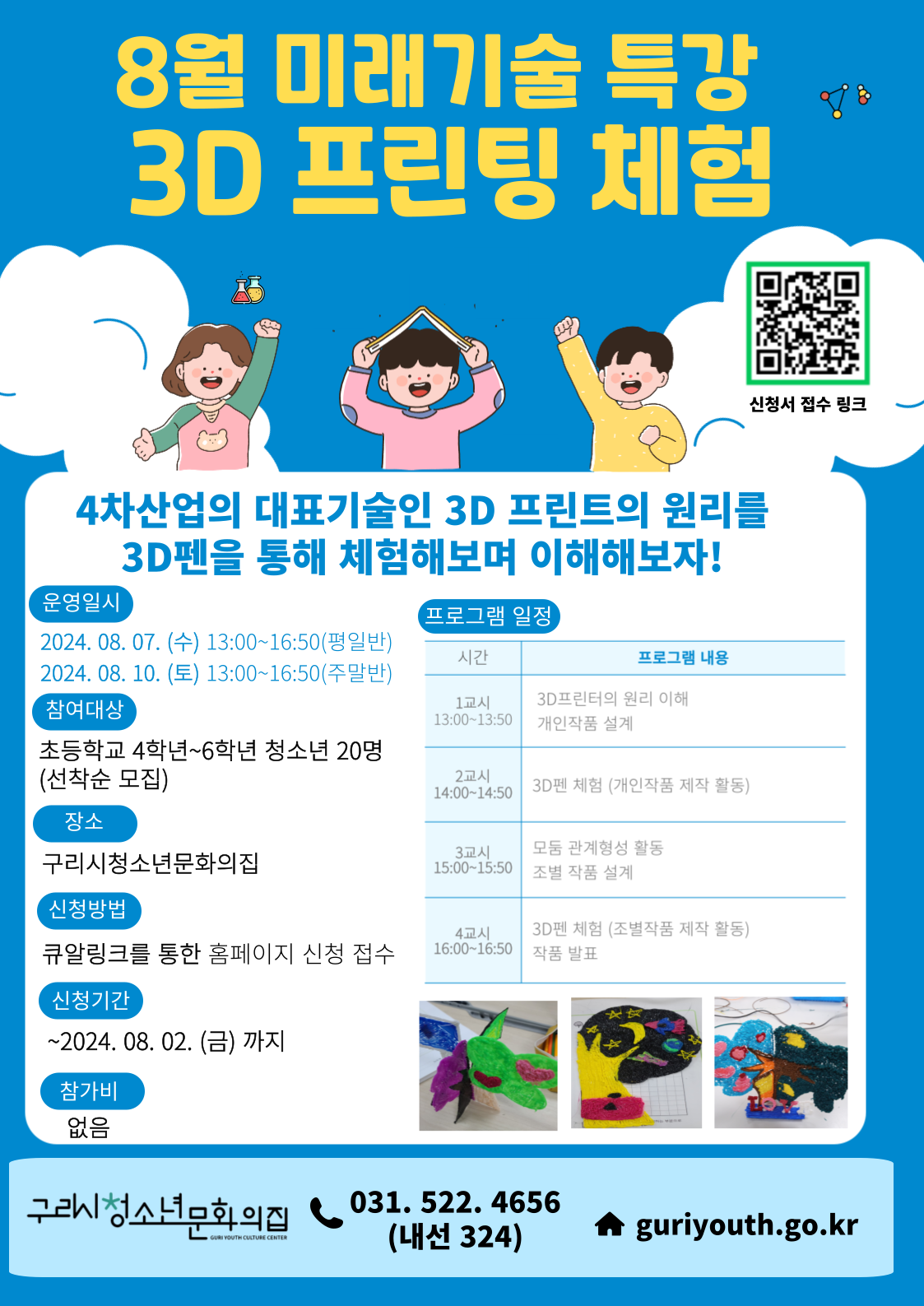 8월 미래기술 특강 3D프린팅 체험 프로그램 참가자 모집! 작성자 이호암 등록일자 2024년 7월 11일 17시 55분 22초 조회 518 제목을-입력해주세요_-001 (24).png [ Size : 498.18KB , Down : 391 ] 미리보기 다운로드 목록보기
