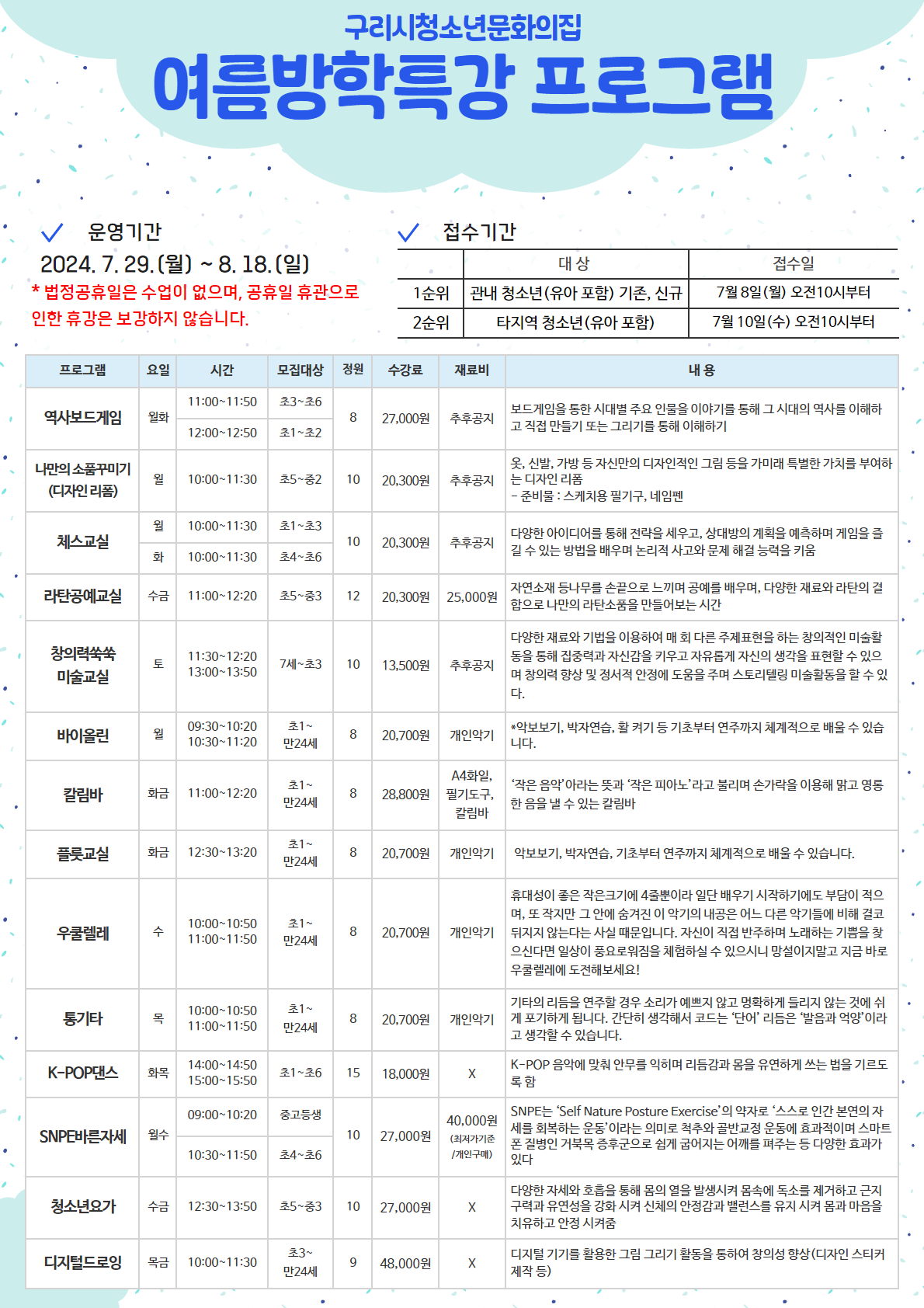 2024 구리시청소년문화의집 여름방학특강 모집 안내 작성자 김윤지 등록일자 2024년 6월 28일 19시 15분 47초 조회 1,485 제목을 입력하세요 (1).jpg [ Size : 1.42MB , Down : 1,971 ] 미리보기 다운로드 목록보기