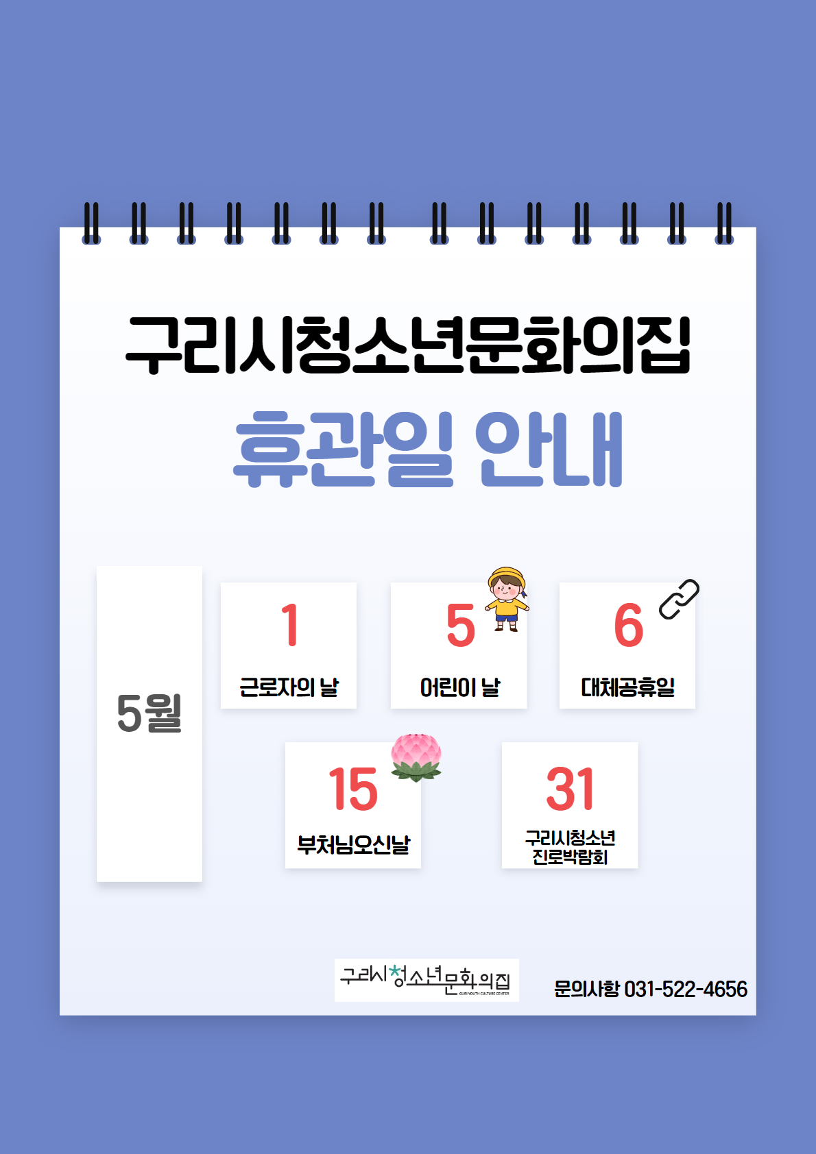 구리시청소년문화의집 5월 휴관일 안내 작성자 진현미 등록일자 2024년 4월 18일 10시 43분 18초 조회 496 [구리시청소년문화의집 5월 휴관일 안내]- 5월 휴관일 확인하시어 이용에 착오 없으시기 바랍니다. 5월 휴관일 안내.jpg [ Size : 584.57KB , Down : 351 ] 미리보기 다운로드 목록보기
