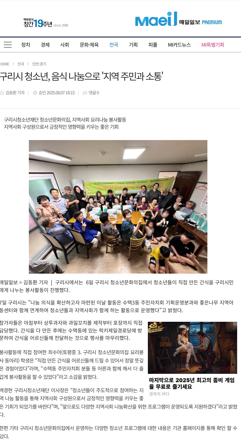 구리시청소년문화의집, 음식나눔으로 지역주민과 소통 (매일일보 외 9곳) 작성자 유병흔 등록일자 2025년 8월 11일 14시 24분 46초 조회 145 화면 캡처 2025-08-11 142414.jpg [ Size : 273.26KB , Down : 63 ] 미리보기 다운로드 목록보기