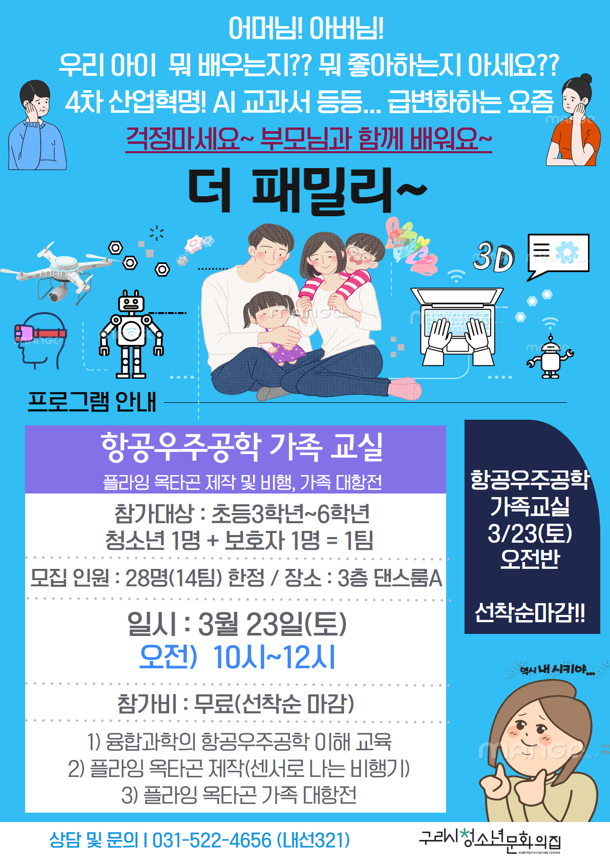 요즘 우리 아이들 교육 너무나 광범위하고... 빠르게 변화하고 있죠?? 4차 산업?, AI 교과서? 등등... 부모님들은 잘 알고 계시나요?? 이런 고민들이 많은 부모님과 청소년 여러분 걱정마세요~ 그래서 구리시청소년문화의집에서 준비했습니다!! 이번 3월은 우리 아이들과 함께 배워보는 - AI 기초와 활용 방법(나만의 AI 영상 제작) - 항공우주공학 활동(플라잉옥타곤 제작) 두 가지 테마의 교육을 알차게 준비하였습니다. 꿀팁!!! 일상에 매일 바쁜 우리 엄마들은 잠시 쉬고, 아빠와 아이가 함께 하는 시간을 가져보는건 어떨까요~!!?? 본 프로그램은 반드시 청소년 1명 + 보호자 1명이 한 팀으로 오셔야 합니다. ** 신청서는 반드시 아이의 정보로 로그인 하시고, 신청자명에 함께 올 보호자명을 아이 이름, 보호자 이름으로 변경하여 신청해주세요. 예) 신청자명 : 김구리(자녀성명), 김문화(보호자성명) 참가 대상 등 세부 사항은 포스터를 참조하여 주세요~ 많은 관심과 참여 부탁드립니다!!! |