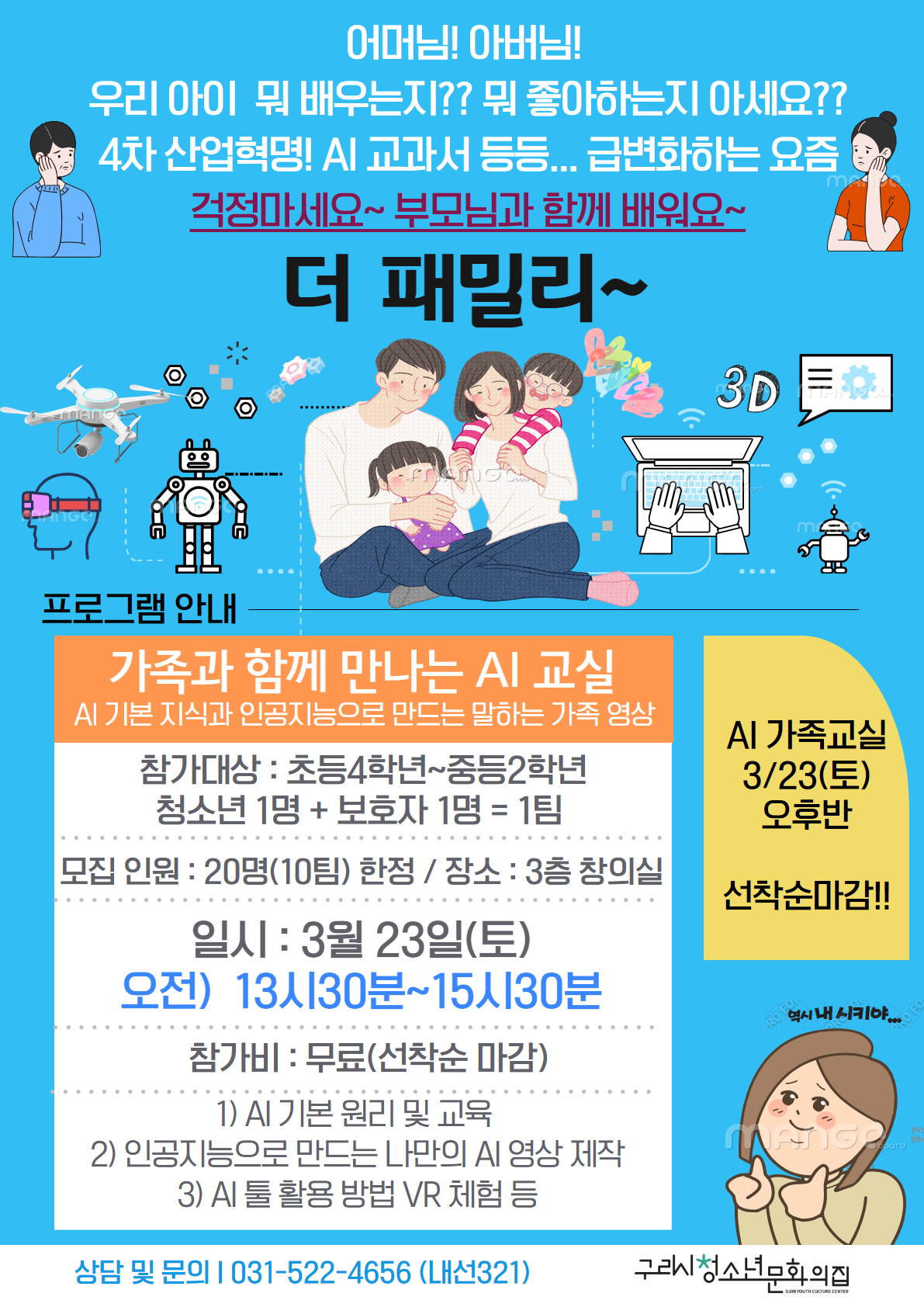 요즘 우리 아이들 교육 너무나 광범위하고... 빠르게 변화하고 있죠?? 4차 산업?, AI 교과서? 등등... 부모님들은 잘 알고 계시나요?? 이런 고민들이 많은 부모님과 청소년 여러분 걱정마세요~ 그래서 구리시청소년문화의집에서 준비했습니다!! 이번 3월은 우리 아이들과 함께 배워보는 - AI 기초와 활용 방법(나만의 AI 영상 제작) - 항공우주공학 활동(플라잉옥타곤 제작) 두 가지 테마의 교육을 알차게 준비하였습니다. 꿀팁!!! 일상에 매일 바쁜 우리 엄마들은 잠시 쉬고, 아빠와 아이가 함께 하는 시간을 가져보는건 어떨까요~!!?? 본 프로그램은 반드시 청소년 1명 + 보호자 1명이 한 팀으로 오셔야 합니다. ** 신청서는 반드시 아이의 정보로 로그인 하시고, 신청자명에 함께 올 보호자명을 아이 이름, 보호자 이름으로 변경하여 신청해주세요. 예) 신청자명 : 김구리(자녀성명), 김문화(보호자성명) 참가 대상 등 세부 사항은 포스터를 참조하여 주세요~ 많은 관심과 참여 부탁드립니다!!! |