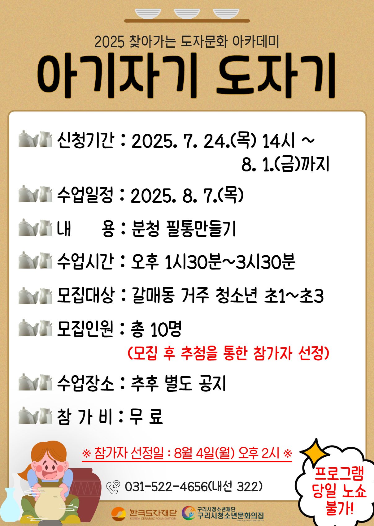 | 프로그램명 | (갈매동 거주 청소년만 신청)2025 아기자기 도자기 - 8회차(분청필통만들기) |
