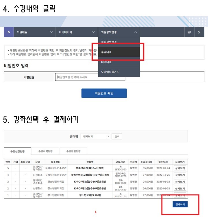 결제오류 발생 시 수강신청내역 확인 후 결제하는 방법을 알고 싶어요