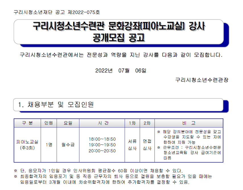 청소년수련관 구리시청소년수련관 문화강좌(피아노 주3회) 강사 모집 공고 작성자 관리자 등록일자 2022년 7월 6일 10시 53분 32초 조회 609 * 응시원서 다운로드 후 작성하여 자격증 사본과 함께 제출해주시기 바랍니다. 피아노(홈페이지).PNG [ Size : 71.72KB , Down : 399 ] 미리보기 다운로드 구리시청소년수련관 청소년교육팀 문화강좌(피아노교실) 강사 모집 공고.pdf [ Size : 224.88KB , Down : 558 ] 다운로드 응시원서.hwp [ Size : 19KB , Down : 479 ] 다운로드 목록보기