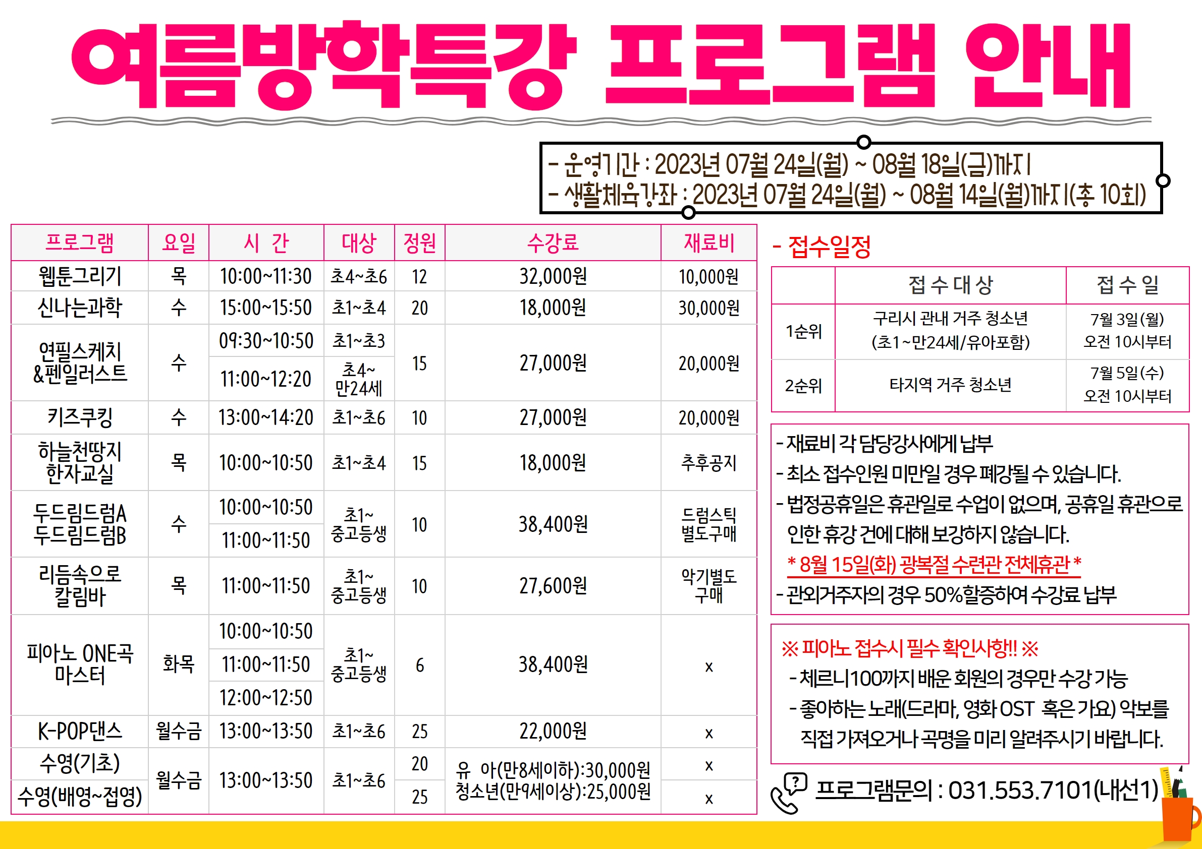 청소년수련관 구리시청소년수련관 여름방학특강 강사 공개모집 공고 작성자 관리자 등록일자 2023년 7월 4일 13시 44분 33초 조회 458 구리시청소년수련관 여름방학특강 강사공개모집 공고.pdf [ Size : 141.08KB , Down : 1,287 ] 다운로드 응시원서, 자기소개서,개인정보 동의서(양식).hwp [ Size : 19KB , Down : 362 ] 다운로드 여름방학특강 운영 안내.jpg [ Size : 1.29MB , Down : 202 ] 미리보기 다운로드 목록보기