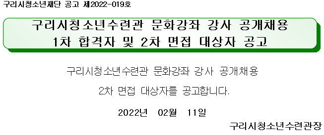 청소년수련관 2022년 구리시청소년수련관 청소년방과후아카데미 시간제강사 1차 합격자 및 2차 면접 대상자 공고 작성자 관리자 등록일자 2022년 2월 11일 16시 43분 20초 조회 691 20220211_164147.png [ Size : 16.3KB , Down : 365 ] 미리보기 다운로드 1차서류심사 결과보고 및 2차면접심사 대상자 공고.pdf [ Size : 90.99KB , Down : 577 ] 다운로드 목록보기