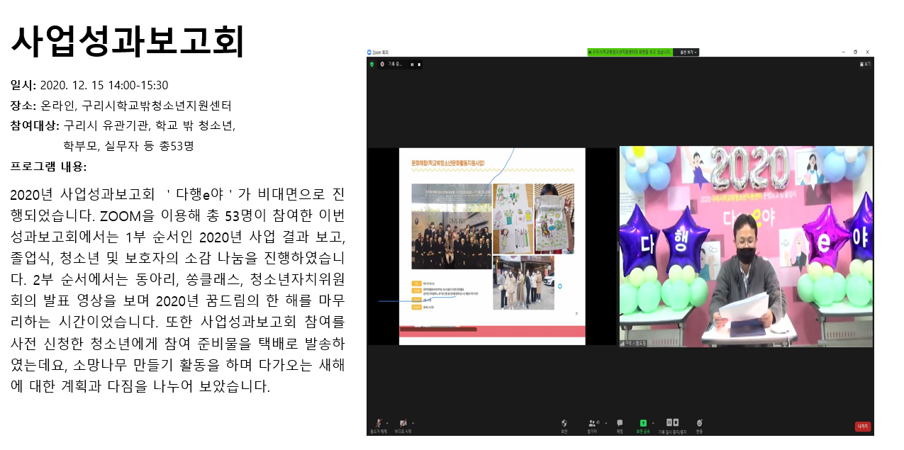 청소년상담복지센터 2020년 12월 사업성과보고회 작성자 관리자 등록일자 2021년 1월 7일 9시 24분 15초 조회 336 1609979055_photo_table.png [ Size : 431.51KB , Down : 145 ] 미리보기 다운로드 목록보기