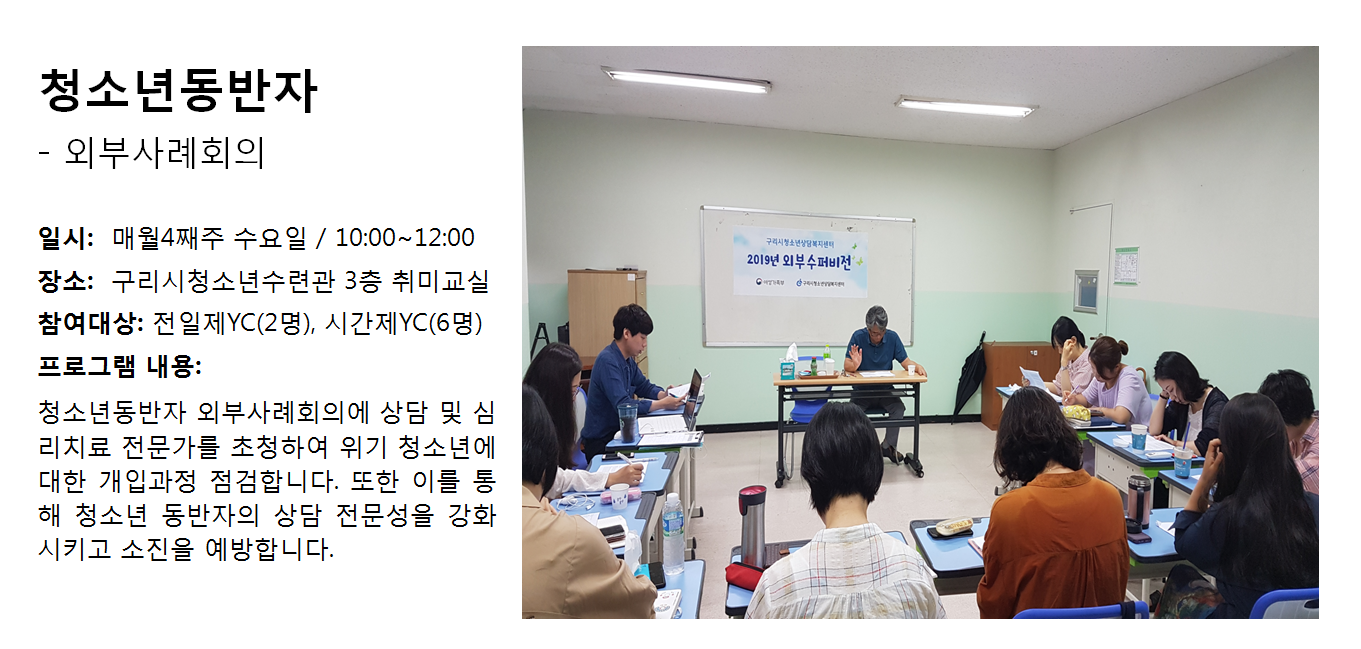 청소년상담복지센터 2019년 7월 YC 외부사례회의 작성자 관리자 등록일자 2019년 8월 5일 13시 58분 18초 조회 339 1564981098_photo_table.png [ Size : 875.49KB , Down : 103 ] 미리보기 다운로드 목록보기