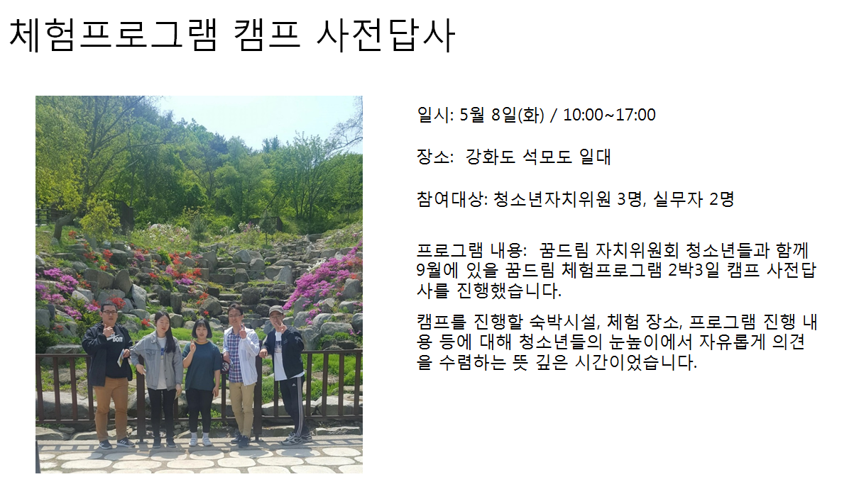 청소년상담복지센터 체험프로그램 캠프 사전답사 작성자 관리자 등록일자 2018년 6월 5일 14시 23분 27초 조회 321 1528176207_photo_table.png [ Size : 633.56KB , Down : 106 ] 미리보기 다운로드 목록보기
