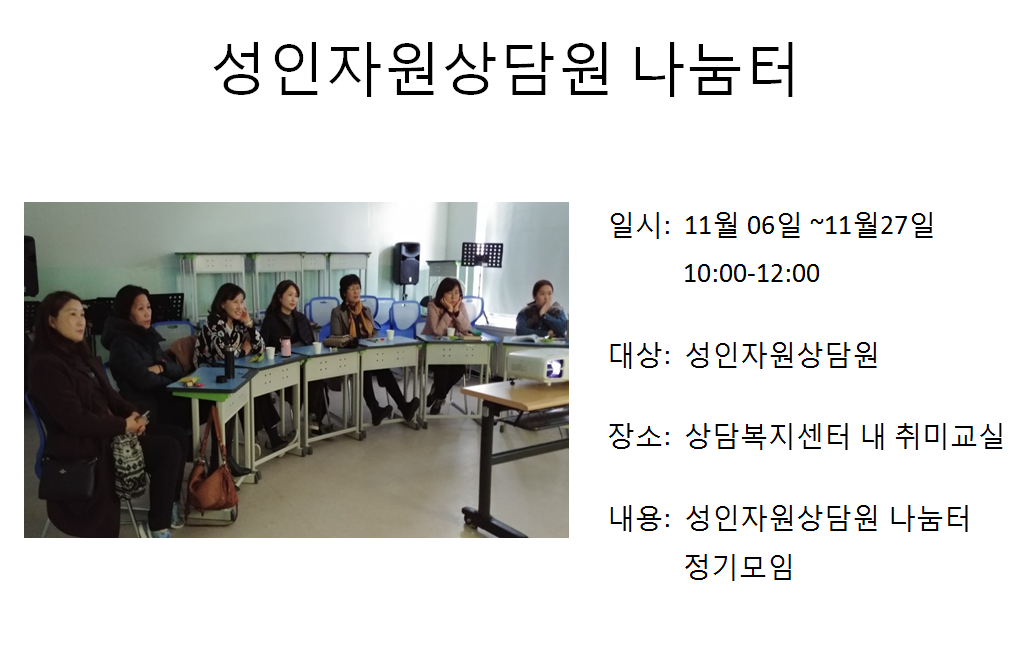 청소년상담복지센터 2018년 11월 성인자원상담원 나눔터 작성자 관리자 등록일자 2018년 12월 5일 15시 47분 17초 조회 364 1543992480_photo_table.png [ Size : 374.08KB , Down : 109 ] 미리보기 다운로드 목록보기