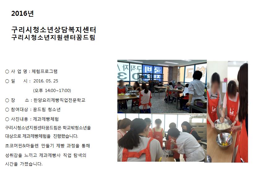 청소년상담복지센터 [꿈드림] 제과제빵 체험 프로그램 작성자 관리자 등록일자 2016년 6월 2일 11시 29분 6초 조회 525 1464834546_photo_table.jpg [ Size : 76.88KB , Down : 110 ] 미리보기 다운로드 목록보기