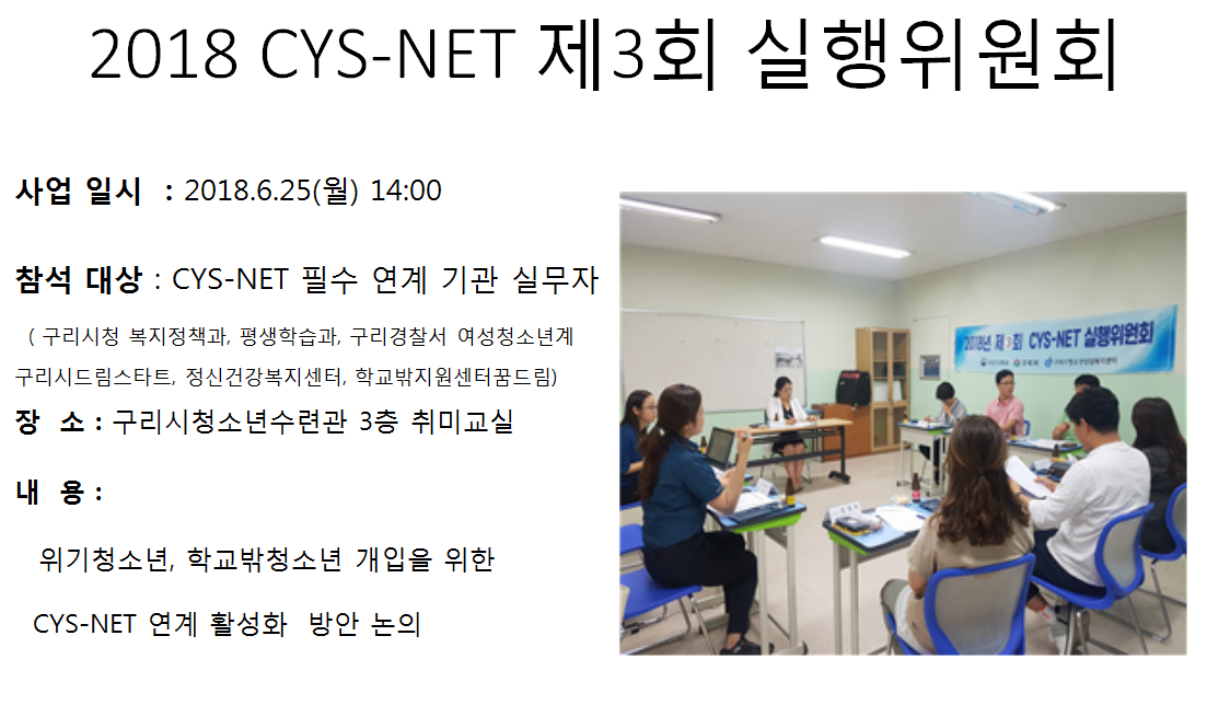 청소년상담복지센터 2018 cys-net 제3회 실행위원회 작성자 관리자 등록일자 2018년 7월 2일 13시 37분 47초 조회 387 1530506267_photo_table.png [ Size : 442.47KB , Down : 119 ] 미리보기 다운로드 목록보기