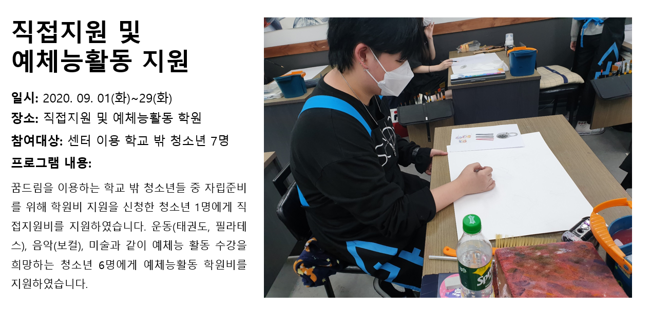청소년상담복지센터 2020년 9월 직접지원 및 예체능활동 지원 작성자 관리자 등록일자 2020년 10월 7일 14시 53분 11초 조회 344 1602049991_photo_table.png [ Size : 750.35KB , Down : 128 ] 미리보기 다운로드 목록보기