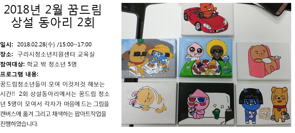 청소년상담복지센터 2018년 2월 꿈드림 상설 동아리 2회 작성자 관리자 등록일자 2018년 3월 5일 13시 32분 42초 조회 363 1520224362_photo_table.jpg [ Size : 94.06KB , Down : 118 ] 미리보기 다운로드 목록보기