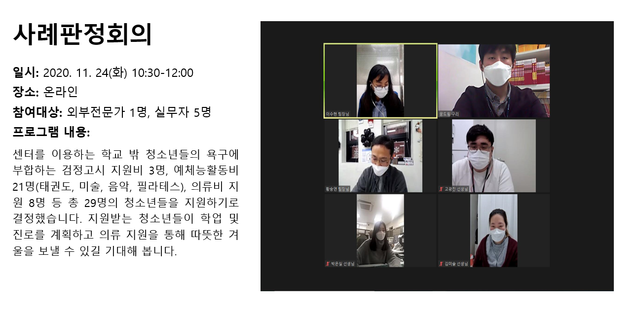 청소년상담복지센터 2020년 11월 사례판정회의 작성자 관리자 등록일자 2020년 12월 4일 11시 15분 1초 조회 388 1607048101_photo_table.png [ Size : 360.22KB , Down : 129 ] 미리보기 다운로드 목록보기
