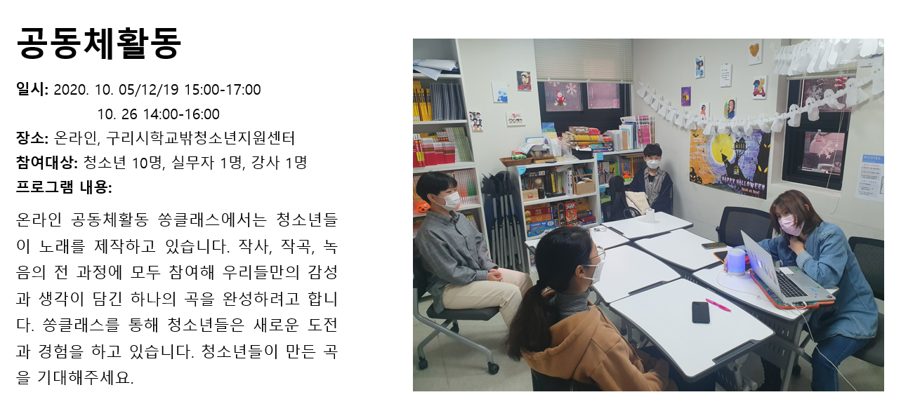 청소년상담복지센터 2020년 10월 공동체활동 작성자 관리자 등록일자 2020년 11월 10일 11시 49분 26초 조회 421 1604976566_photo_table.png [ Size : 734.6KB , Down : 133 ] 미리보기 다운로드 목록보기